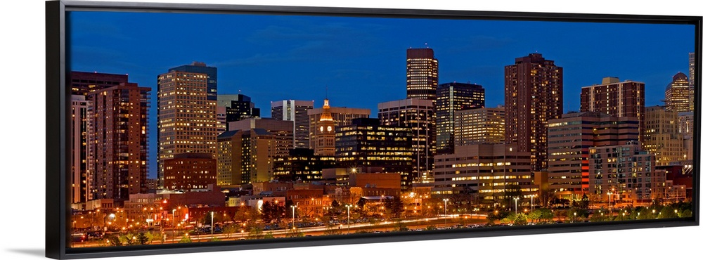 <p>Panoramic photograph of lit up skyline under a clear sky.</p>