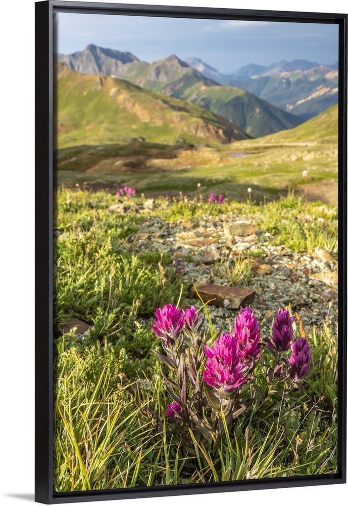 <p>USA, Colorado, San Juan Mountains. Hurricane Pass and wildflowers.</p>