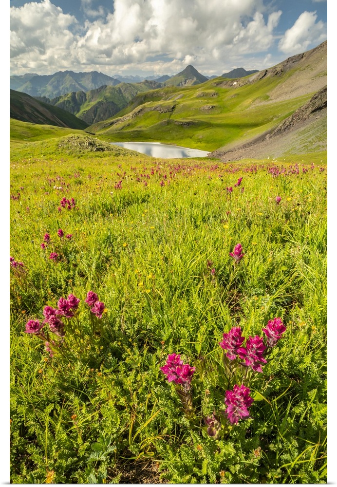 <p>USA, Colorado, San Juan Mountains. Indian paintbrush flowers and lake in Placer Gulch.</p>