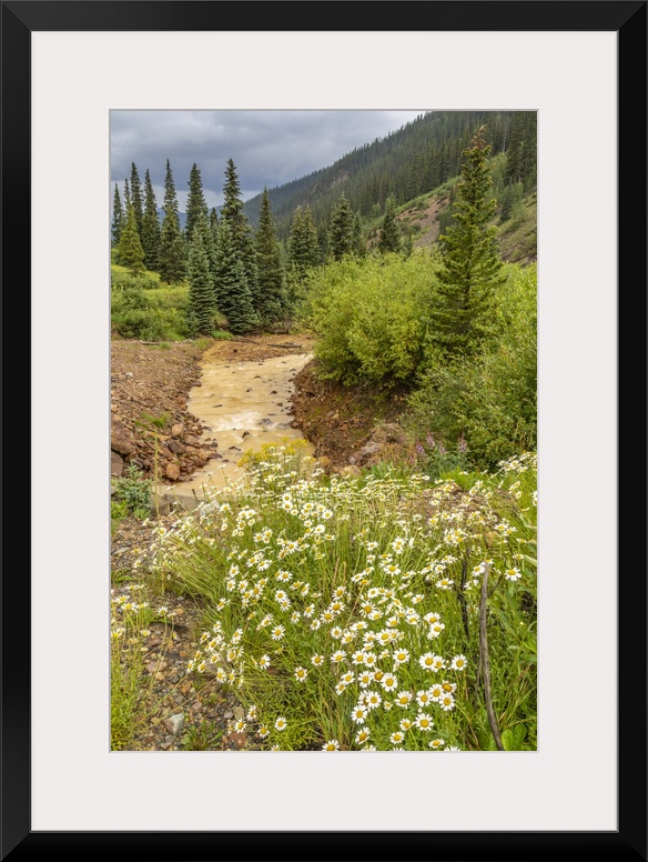 <p>USA, Colorado, San Juan Mountains. Scenic with Cement Creek and daisies.</p>
