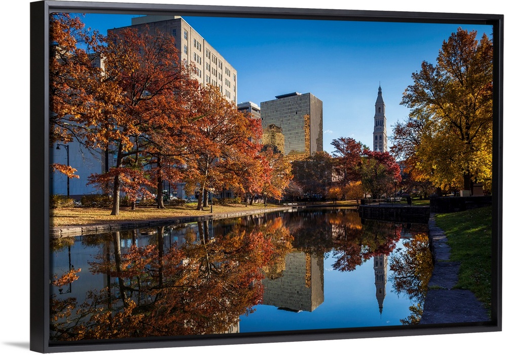 <p>USA, Connecticut, Hartford, Bushnell Park, reflection of office buildings and Travelers Tower, Headquarters of the Travelers Insurance Company</p>