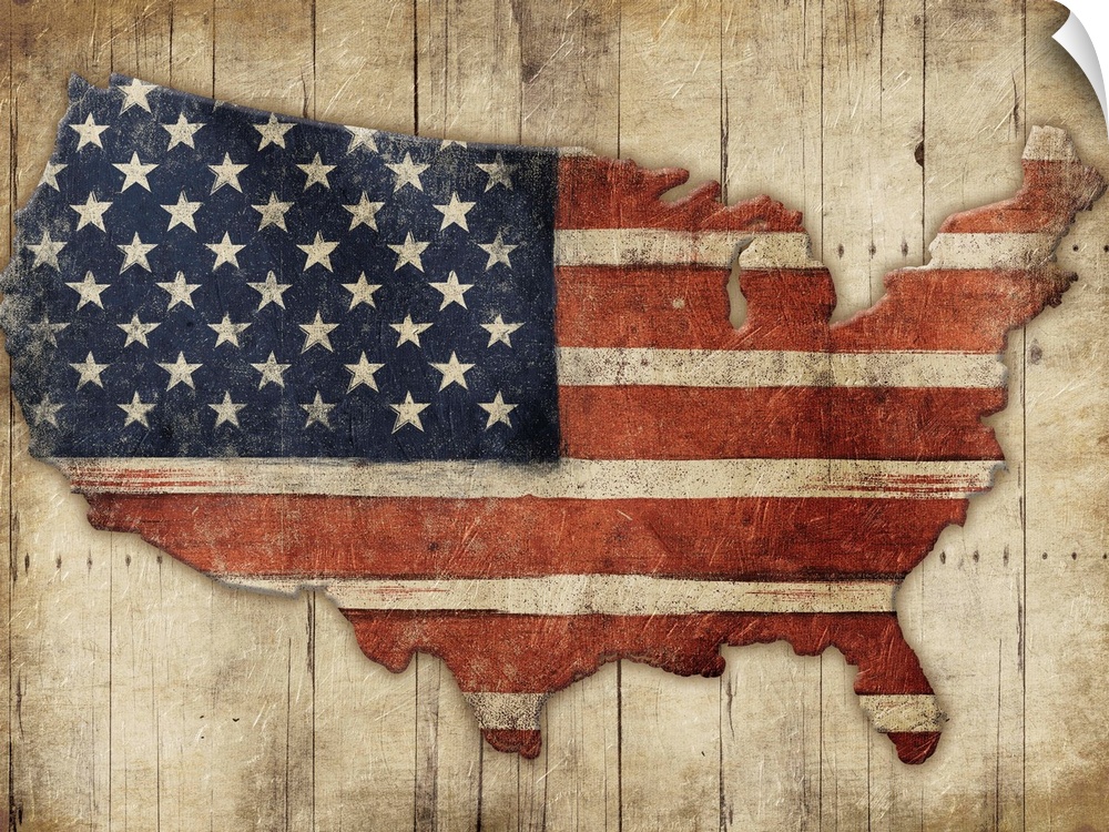 <p>A rustic map of the United States made out of the American flag on a wood panel background.</p>
