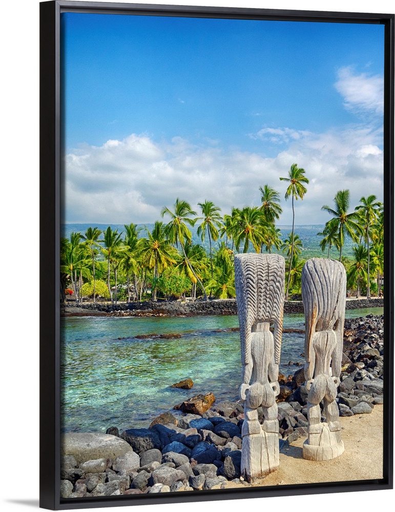 <p>USA, Hawaii, Big Island. Palm trees and ancient tiki wooden carvings at the National Historic Park Pu'uhonua o Honaunau.</p>