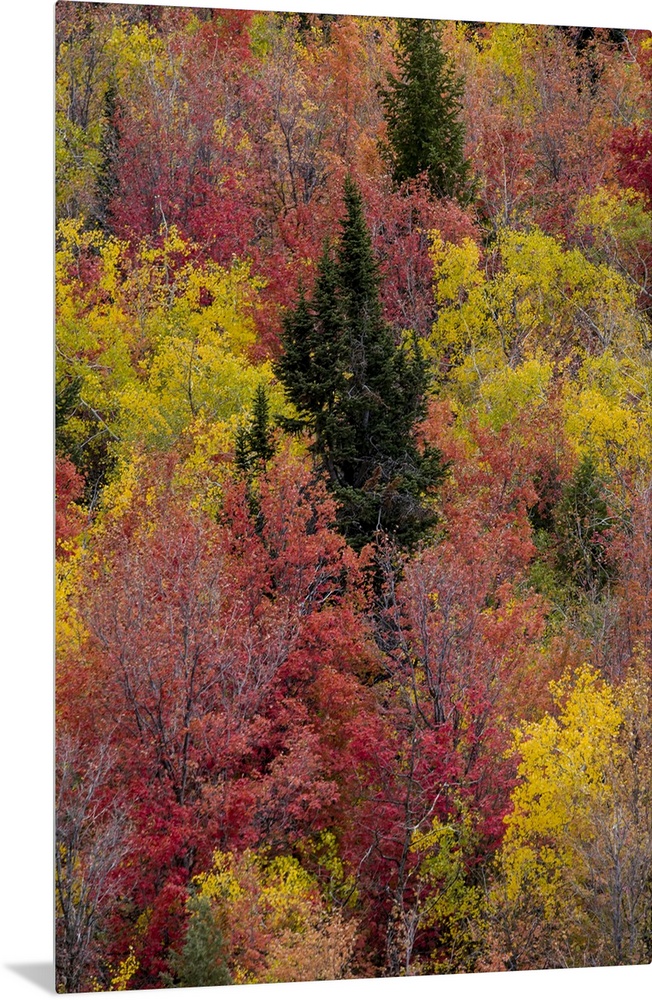 <p>USA, Idaho. St. Charles along Green Canyon Road with hillside blazing in fall color with canyon maple and Aspens.</p>