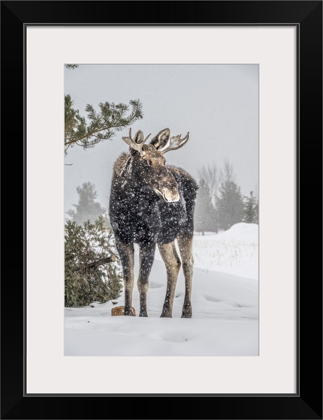 <p>USA, Idaho. Young bull moose portrait in a snow storm.</p>
