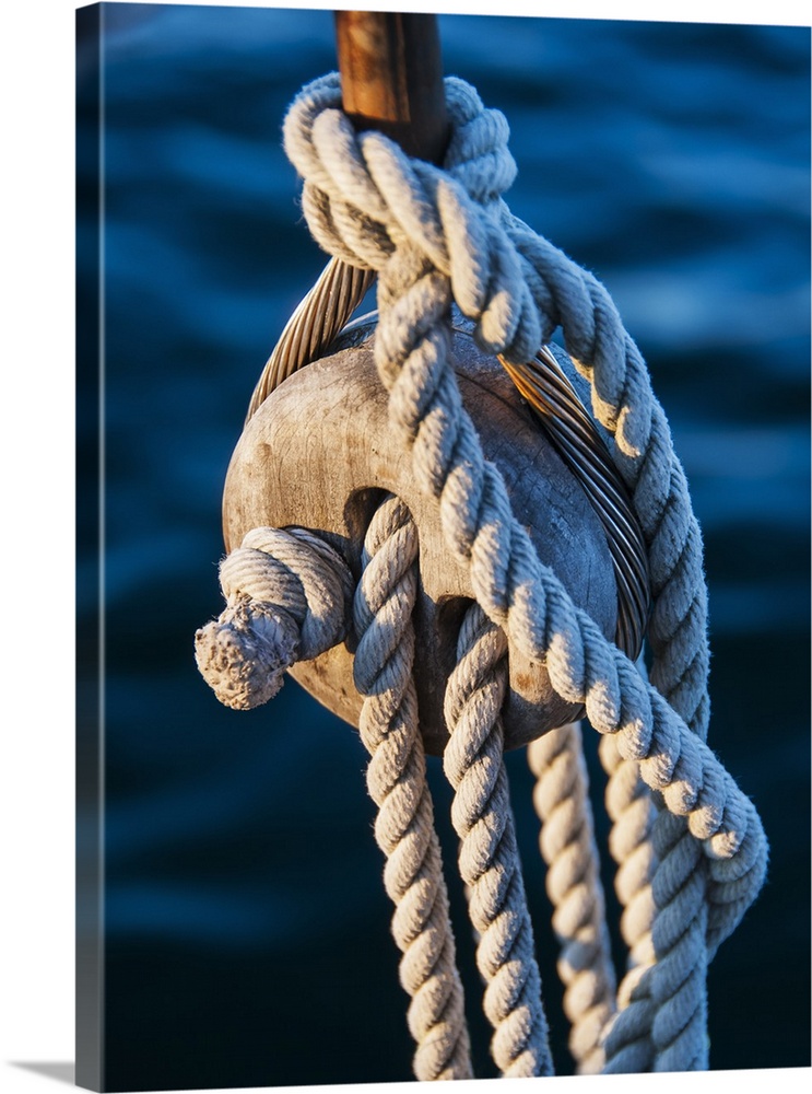 USA, Maine, Camden, Close-up view of yacht ropes against rippled water
