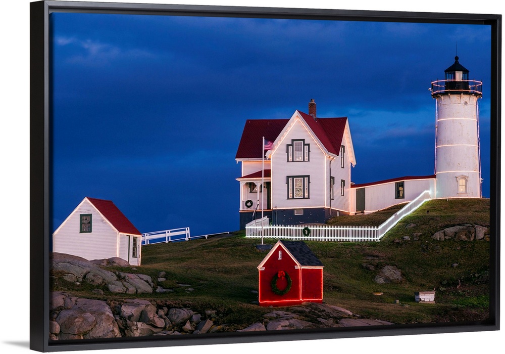 <p>USA, Maine, York Beach, Nubble Light Lighthouse with Christmas decorations at dusk</p>