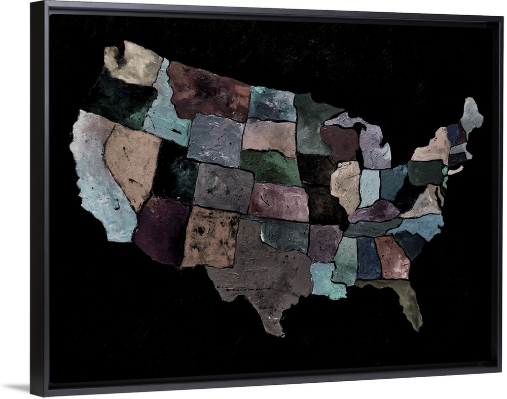<p>Painting of the United States of America in multi-color paints in neutral colors against a black background.</p>