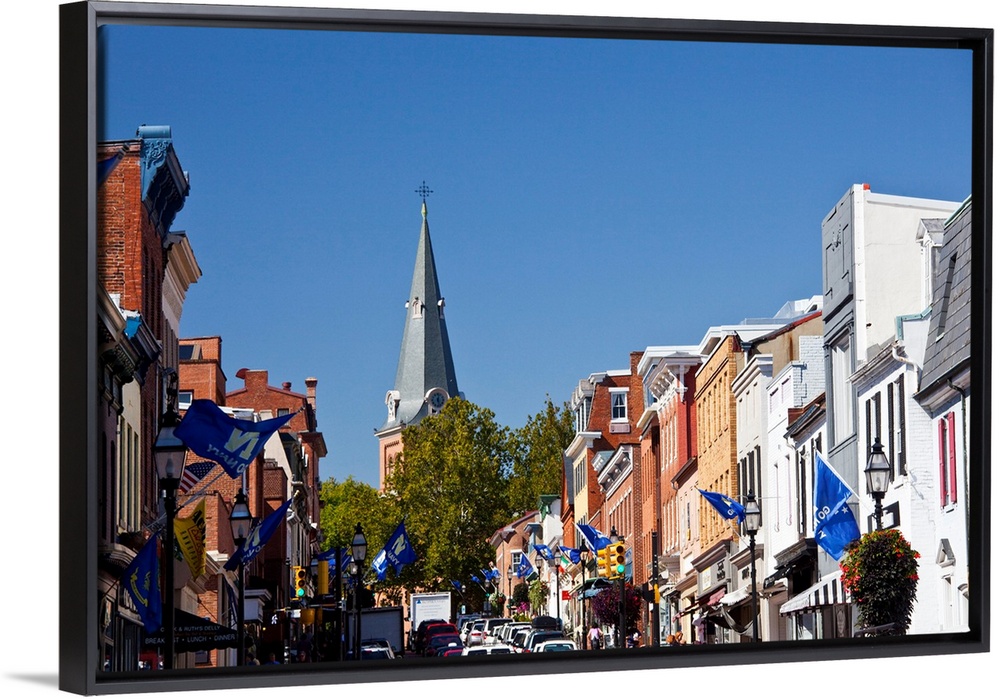 <p>USA, Maryland, Annapolis. Main Street buildings and St. Anne's Church.</p>
