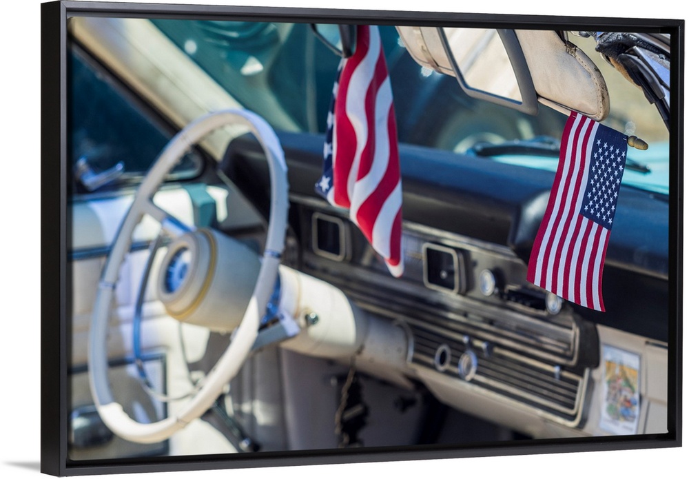 <p>USA, Massachusetts, Cape Ann, Gloucester, classic cars, 1960's car interior with US flag</p>