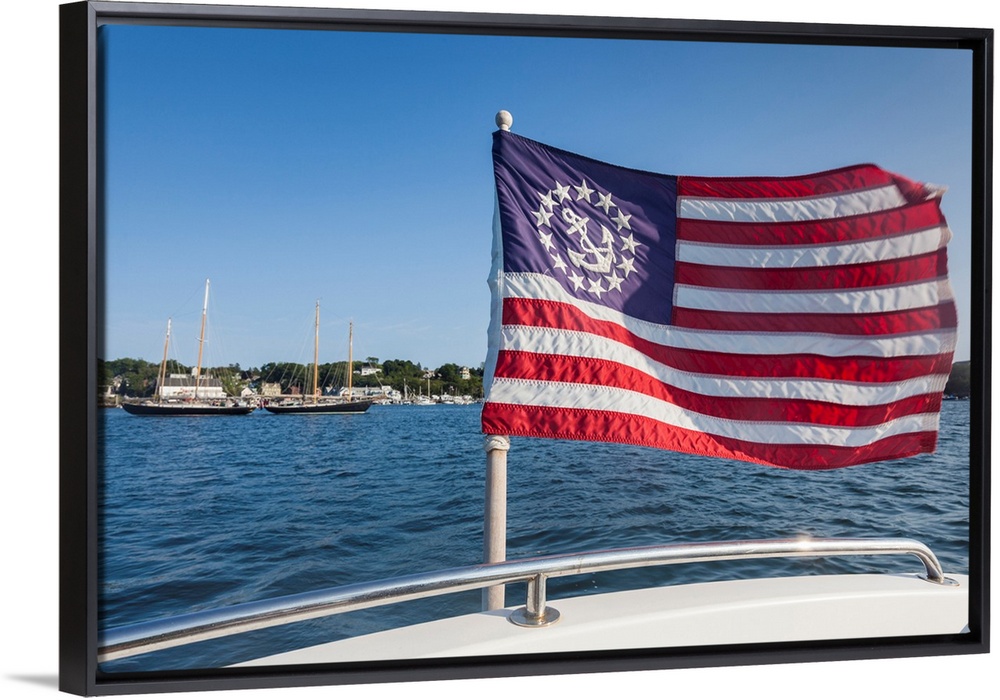 <p>USA, Massachusetts, Cape Ann, Gloucester, America's Oldest Seaport, Gloucester Schooner Festival, schooner US flag</p>