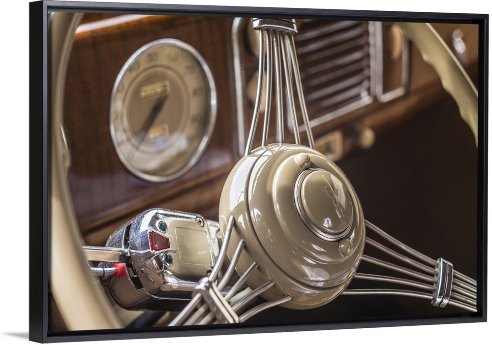 <p>USA, Massachusetts, Essex, Antique Cars, 1940's-Era Steering Wheel Interior Detail</p>