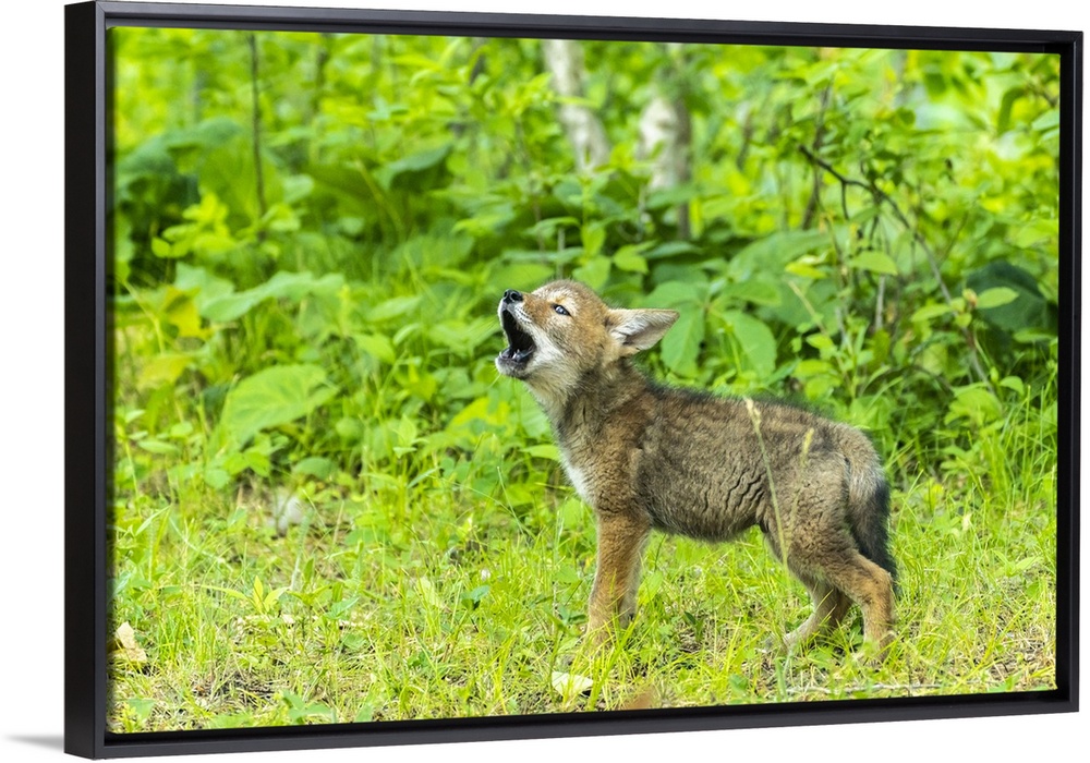 <p>USA, Minnesota. Captive coyote pup howling.</p>
