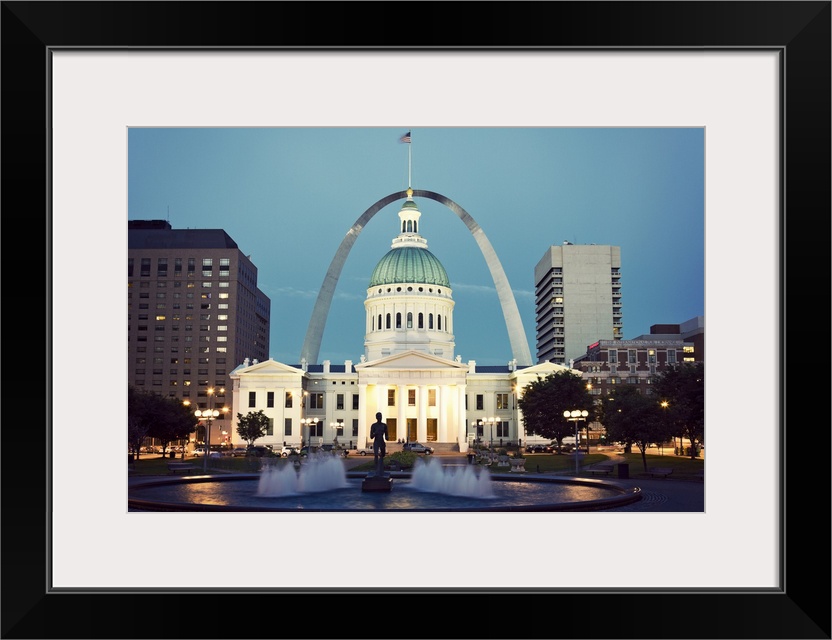 <p>USA, Missouri, St. Louis, Fountain and courthouse at dusk</p>