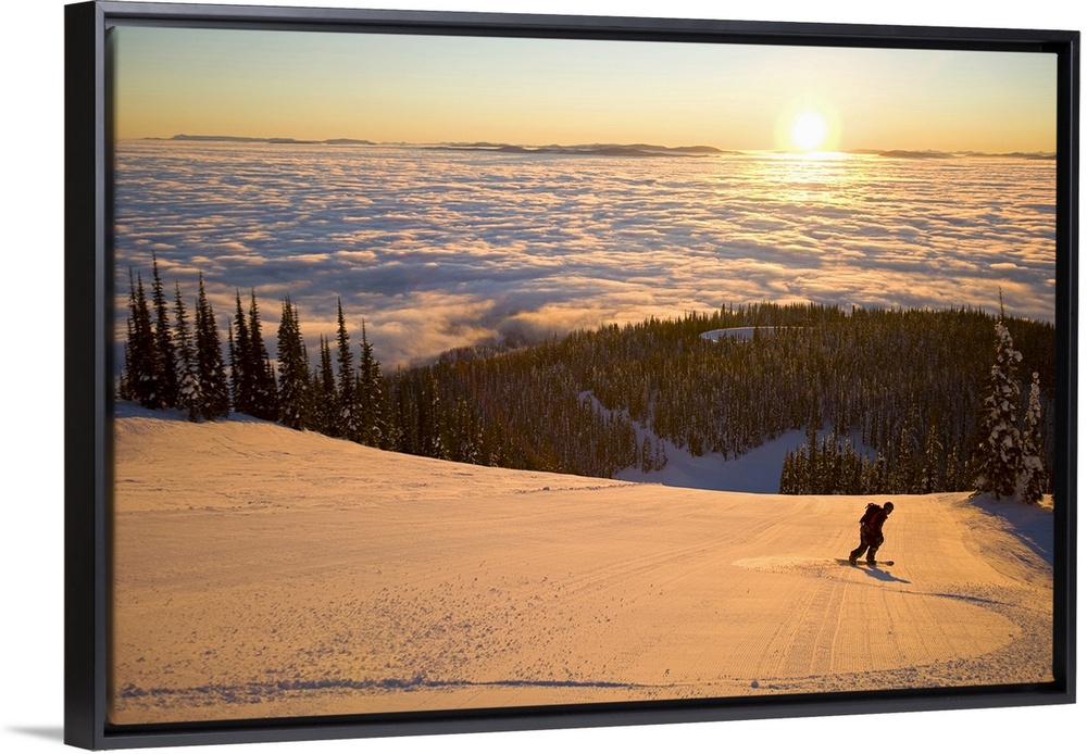 <p>Oversized horizontal photograph of a man snowboarding down a hill that is high above a winter landscape below, where a large forest of pine trees meets a vast landscape of low cloud cover, as the sun set on the horizon, in Whitefish, Montana.</p>