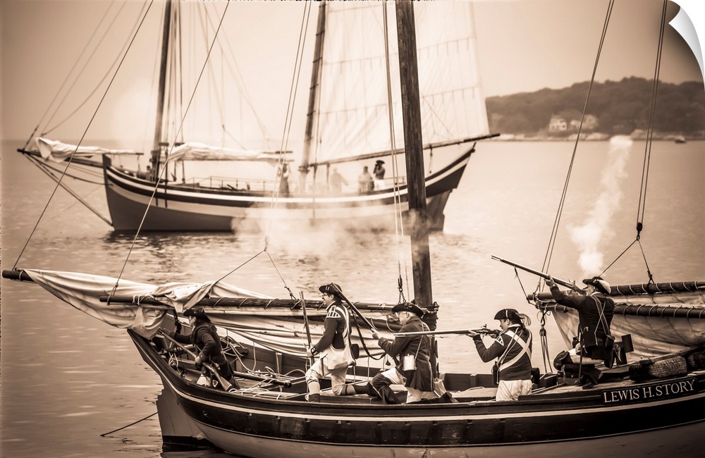 <p>USA, New England, Massachusetts, Cape Ann, Gloucester, re-enactors of the Battle of Gloucester, August 8-9, 1775, battle convinced the Americans of the need of creating an American Navy to fight against the British, American Revolutionary War-era Naval Vessels, NR.</p>