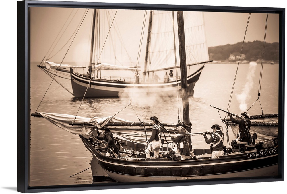 <p>USA, New England, Massachusetts, Cape Ann, Gloucester, re-enactors of the Battle of Gloucester, August 8-9, 1775, battle convinced the Americans of the need of creating an American Navy to fight against the British, American Revolutionary War-era Naval Vessels, NR.</p>