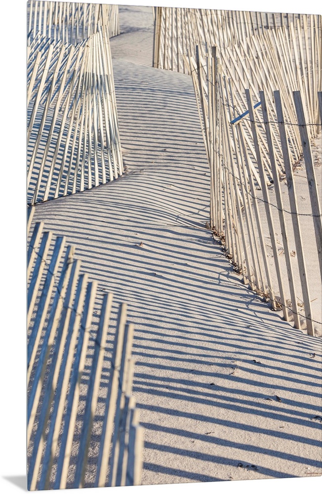 <p>USA, New England, Massachusetts, Nantucket Island, Madaket, Madaket Beach, sand fence and shadows.</p>