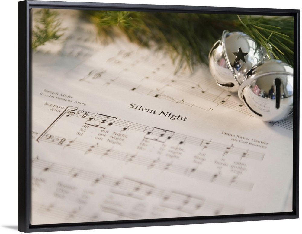 <p>USA, New Jersey, Jersey City, Christmas baubles on carol music sheet</p>