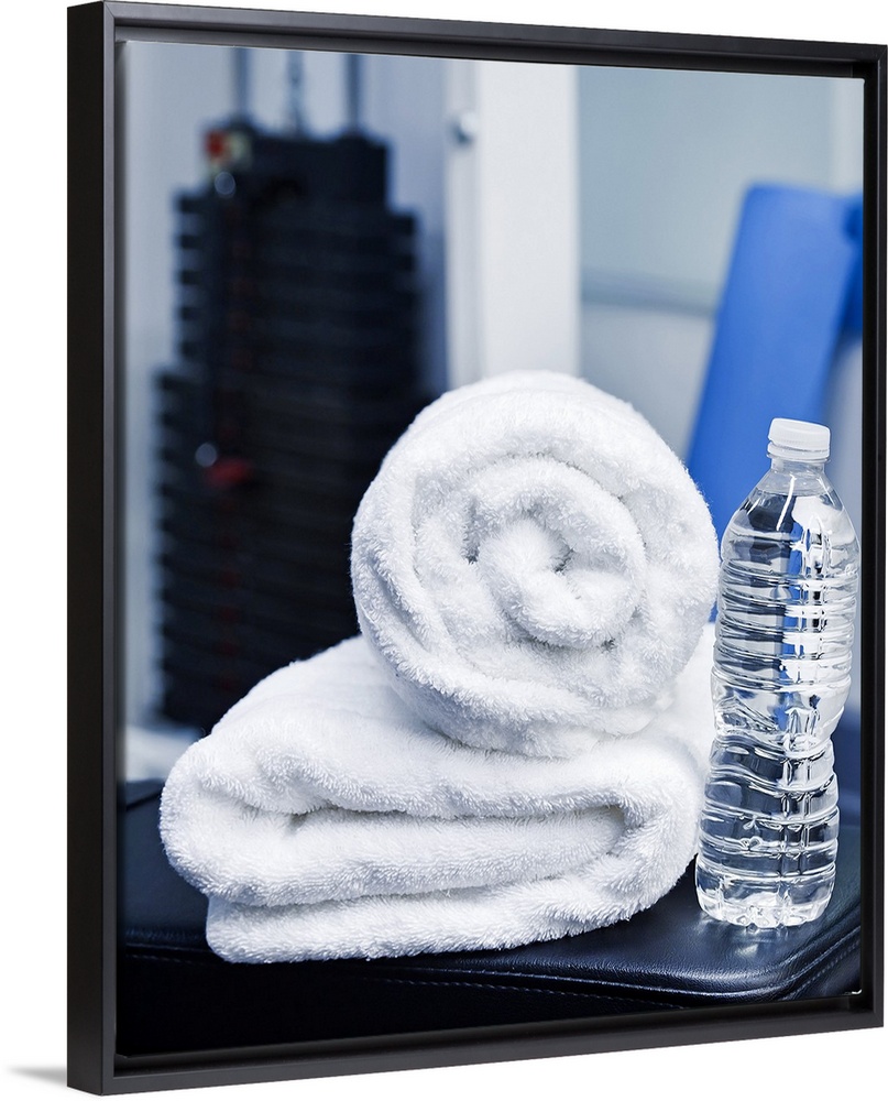 <p>USA, New Jersey, Jersey City, Close up of towel and bottle in gym</p>