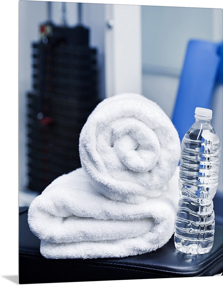 <p>USA, New Jersey, Jersey City, Close up of towel and bottle in gym</p>