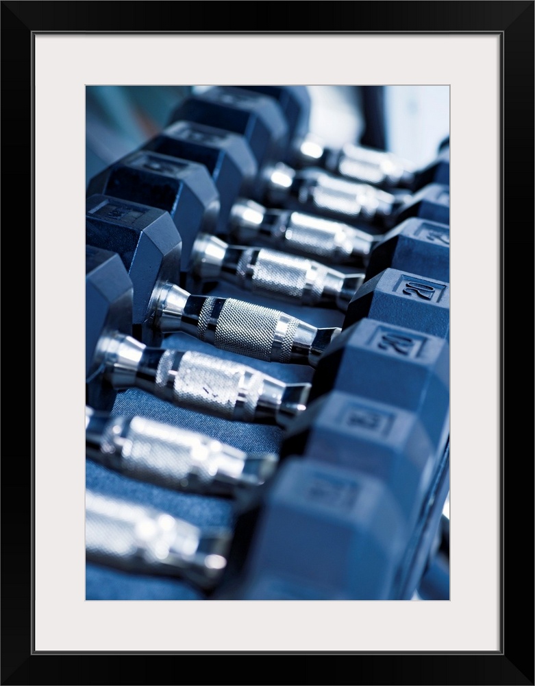 <p>USA, New Jersey, Jersey City, Row of dumbbells in gym</p>
