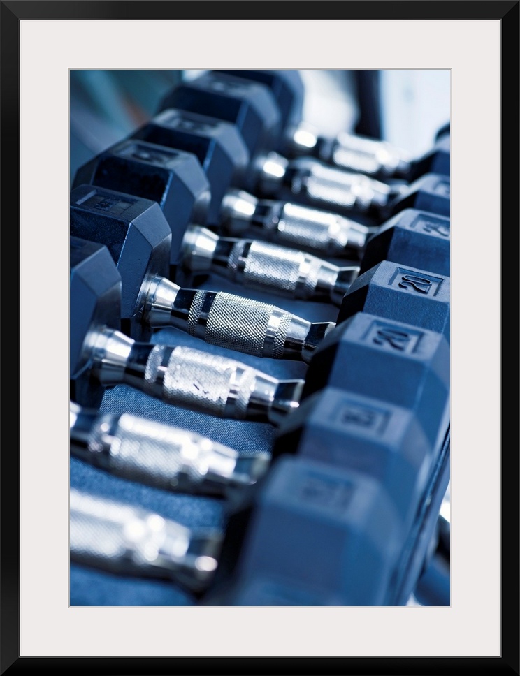 <p>USA, New Jersey, Jersey City, Row of dumbbells in gym</p>
