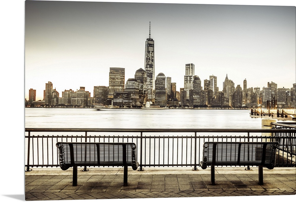 <p>USA, New Jersey, Sundial, Lower Manhattan skyline with One World Trade Center and Freedom Tower at sunrise.</p>