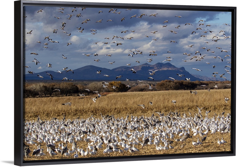 <p>USA, New Mexico. Bosque Del Apache National Wildlife Refuge, snow geese flying.</p>