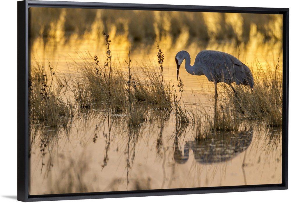 <p>USA, North America, New Mexico. Bosque Del Apache National Wildlife Refuge, Sandhill Crane In Water At Sunset.</p>