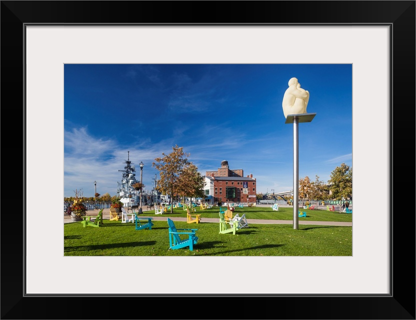 <p>USA, New York, Western New York, Buffalo, Canalside Park, renovated former industrial area, Silent Poets sculpture by Jaume Plensa, 2012.</p>