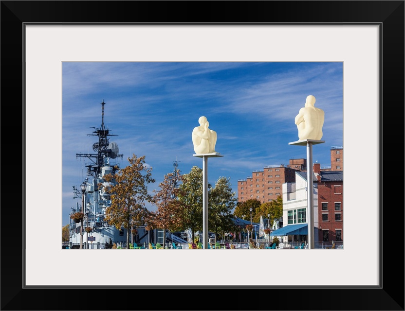 <p>USA, Western New York, Buffalo, Canalside Park, renovated former industrial area, Silent Poets sculpture by Jaume Plensa, 2012.</p>