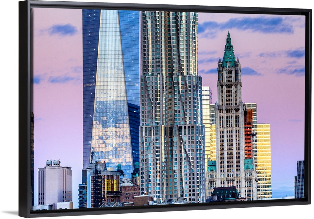 <p>USA, New York City, Brooklyn, Brooklyn Bridge, The Freedom Tower, Beekman Tower and Trump Building at dawn, viewed from Brooklyn.</p>