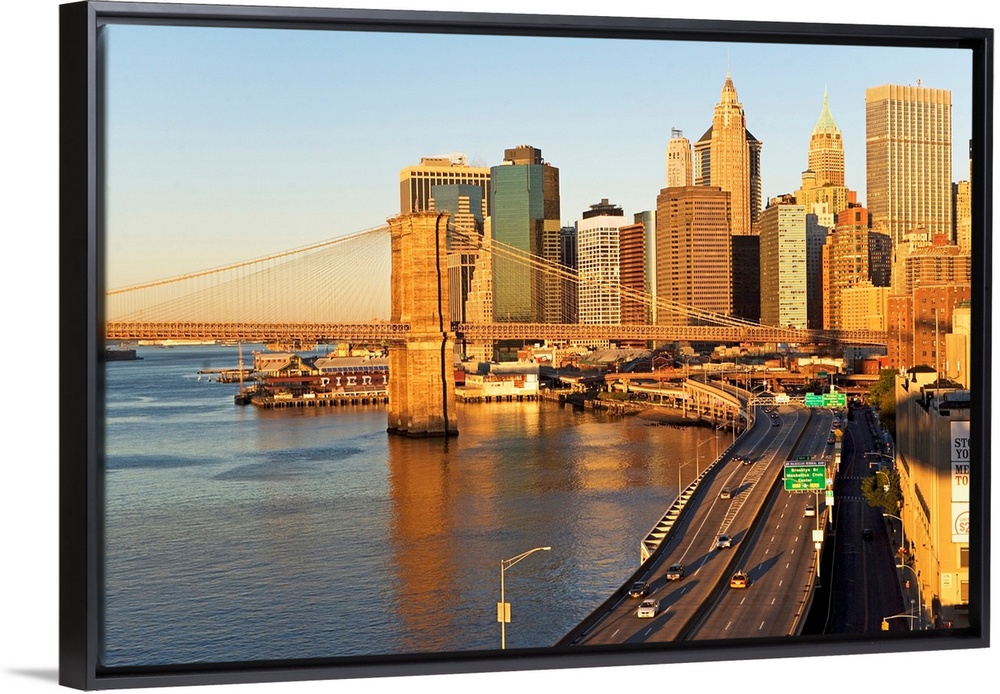 <p>A section of the New York City skyline is photographed with the Hudson river to the left and a bridge stretching over it and into the city.</p>