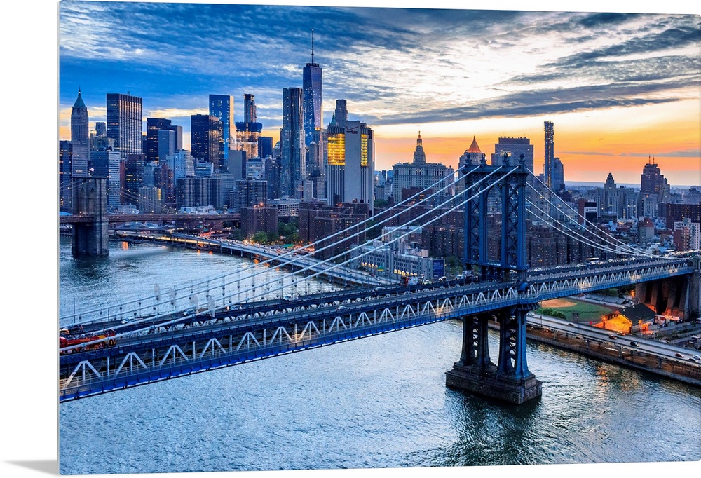 <p>USA, New York City, East River, Manhattan, Lower Manhattan, Aerial view towards Lower Manhattan, Brooklyn Bridge with One World Trade Center and Freedom Tower at sunset.</p>