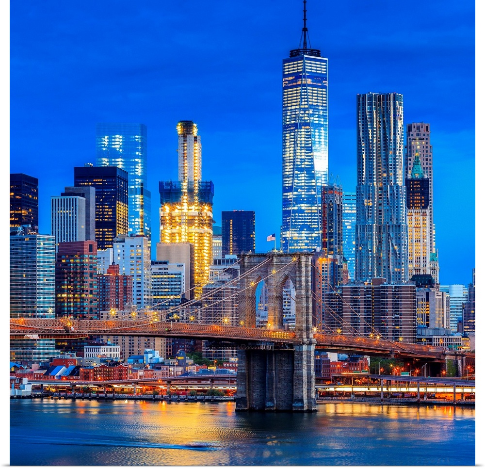 <p>USA, New York City, Brooklyn, East River, Dumbo, Brooklyn Bridge, View of the Lower Manhattan and Financial District skyline across the East River with Brooklyn Bridge and Freedom Tower in the background.</p>