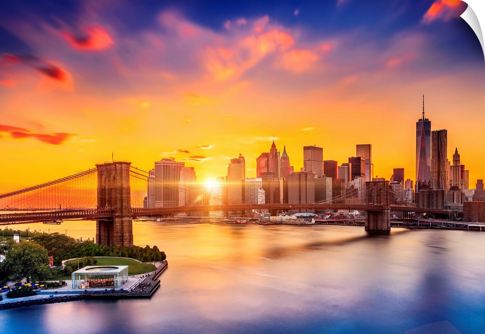 <p>USA, New York City, Manhattan, East River, Brooklyn Bridge, View from Dumbo towards Manhattan skyline with One World Trade Center and Freedom Tower at sunset.</p>