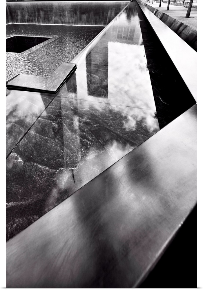 <p>USA, New York City, World Trade Center, Freedom Tower reflected in one of the pools of the National 9-11 Memorial.</p>