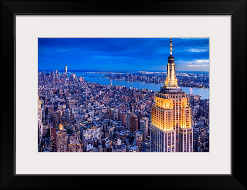 <p>USA, New York City, Manhattan, Midtown, Empire State Building, Hudson, Aerial view towards Empire State Building and Lower Manhattan with One World Trade Center at night.</p>