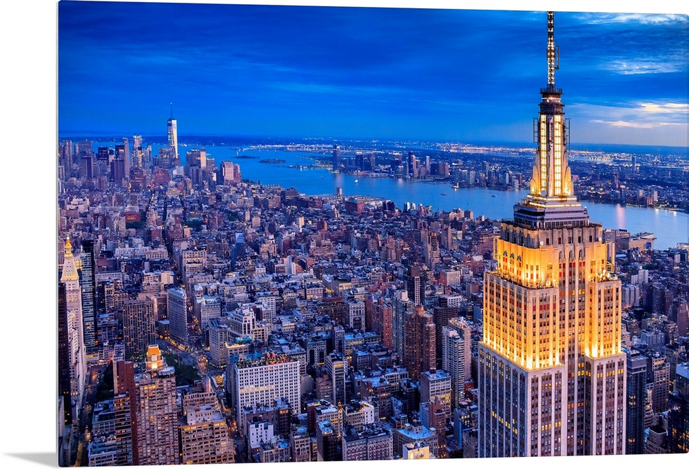 <p>USA, New York City, Manhattan, Midtown, Empire State Building, Hudson, Aerial view towards Empire State Building and Lower Manhattan with One World Trade Center at night.</p>