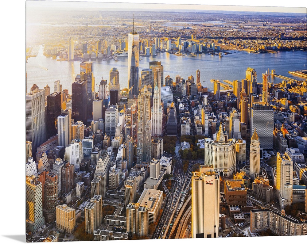 <p>USA, New York City, Lower Manhattan, Aerial view towards One World Trade Center at sunset.</p>
