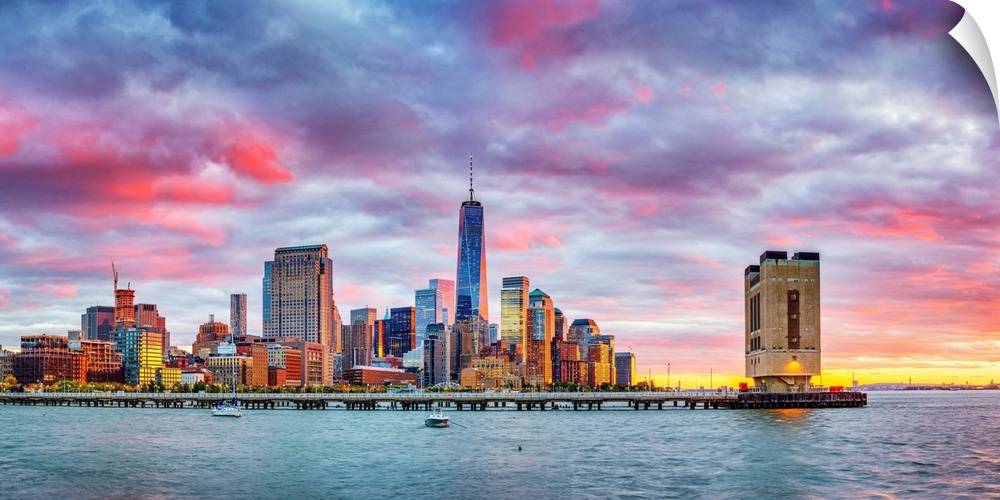 <p>USA, New York City, Lower Manhattan, Financial District and Freedom Tower, view from Pier 40 at sunset.</p>