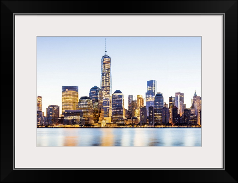 <p>USA, New York City, Lower Manhattan, One World Trade Center, Freedom Tower, Lower Manhattan skyline from New Jersey, at sunrise.</p>