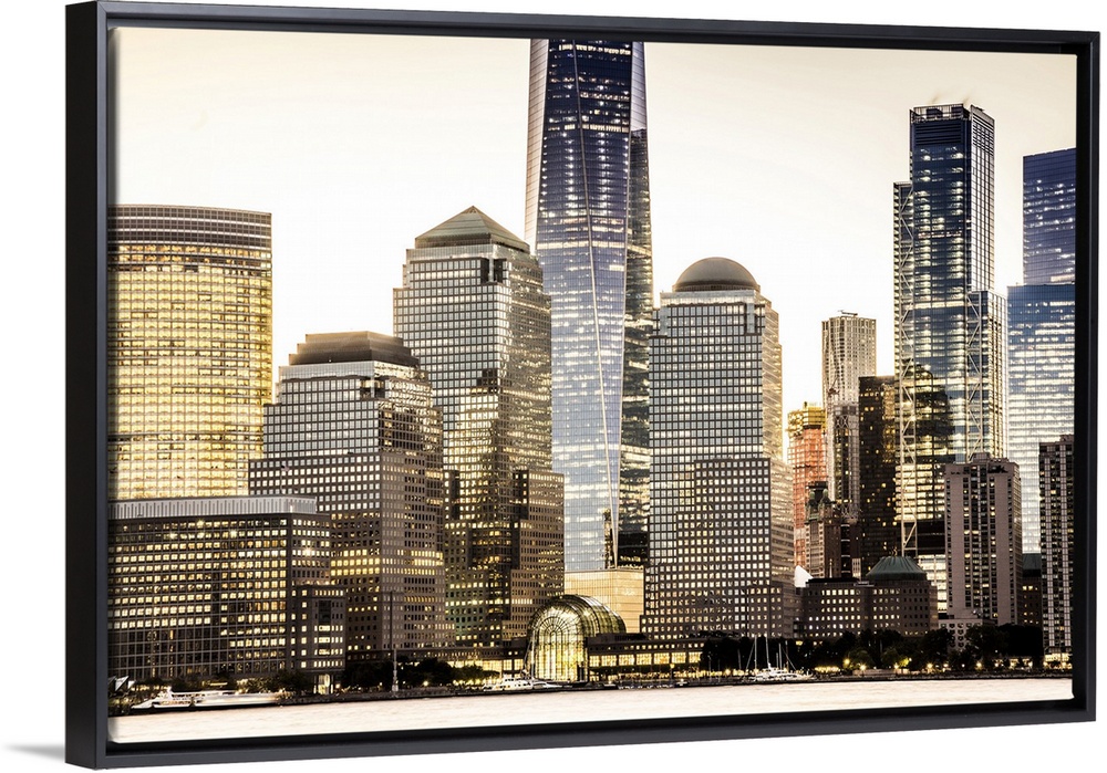 <p>United States, New York City, Manhattan, Lower Manhattan, One World Trade Center, Freedom Tower, View from New Jersey towards Lower Manhattan at sunrise.</p>