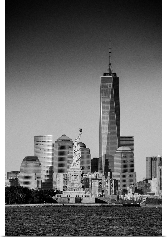 <p>USA, New York City, Lower Manhattan, Lower Manhattan skyline with Freedom Tower and Statue of Liberty.</p>