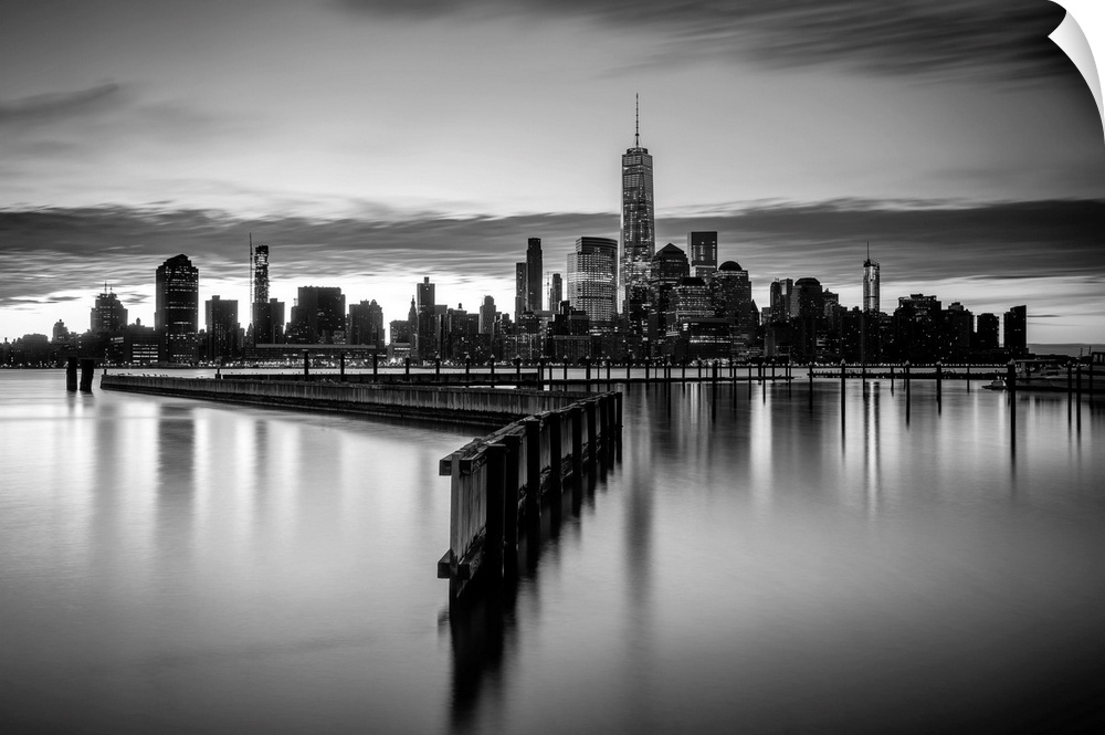 <p>USA, New York City, Lower Manhattan, Lower Manhattan skyline with One World Trade Center and Freedom Tower from New Jersey, at sunrise.</p>