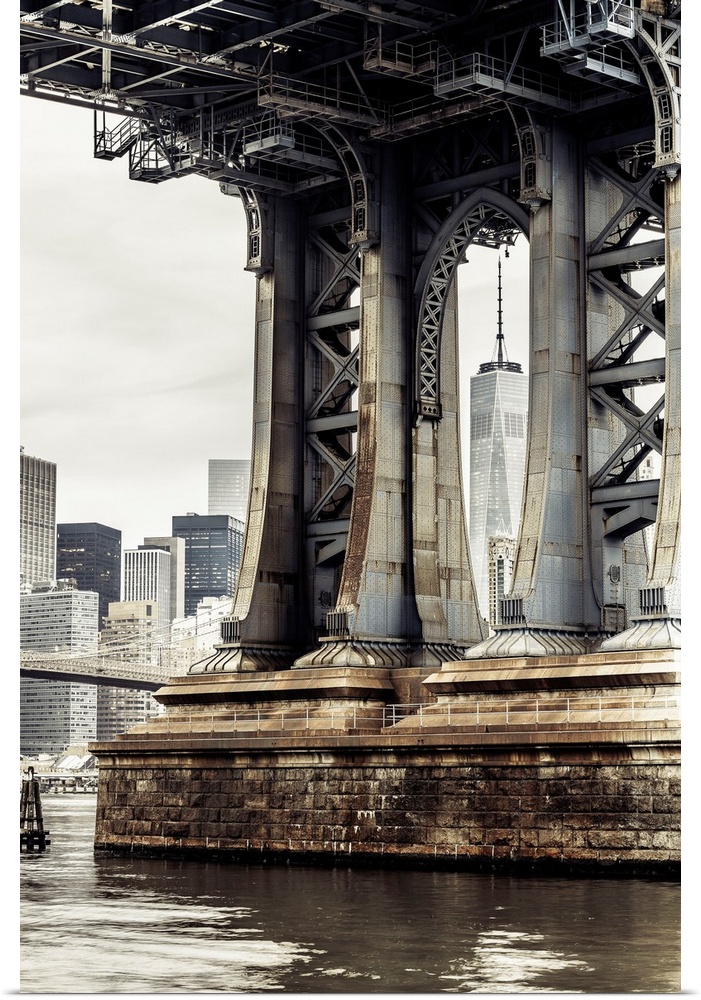 <p>USA, New York City, Manhattan Bridge pylon and Freedom Tower in background.</p>