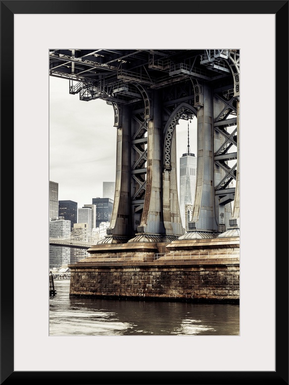 <p>USA, New York City, Manhattan Bridge pylon and Freedom Tower in background.</p>