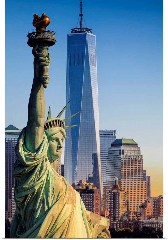 <p>USA, New York City, Manhattan, Lower Manhattan, Liberty Island, Statue of Liberty, Statue of Liberty and Freedom Tower.</p>