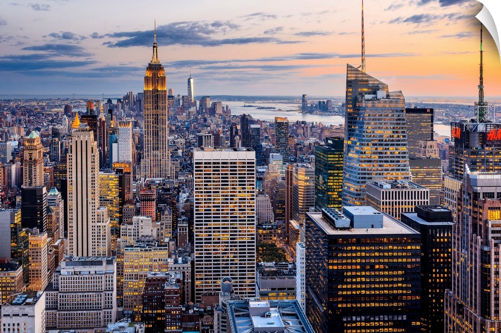 <p>USA, New York City, Manhattan, Midtown, Empire State Building, Cityscape with the Empire State Building and the Freedom Tower as seen from Top of the Rock Observation Deck at the Rockefeller Center at night.</p>